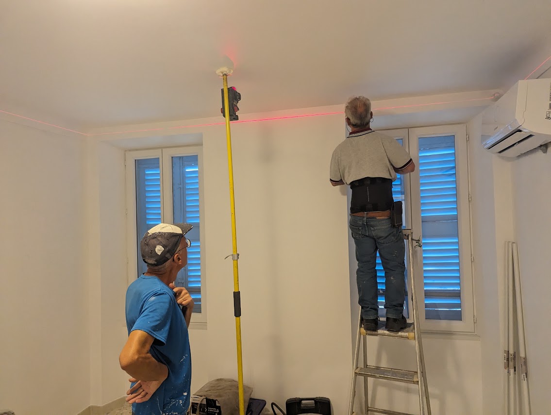 Au plafond, on s'y met à 3 pour dérouler et glisser les rouleaux de laine de verre sur les rails. C'est fastidieux. En plus, l'échelle de mon maçon a glissé et il est tombé sur la tête dans la salle de bains. Ça lui a valu quelques points de suture à la tête et 3 jours d’arrêt.