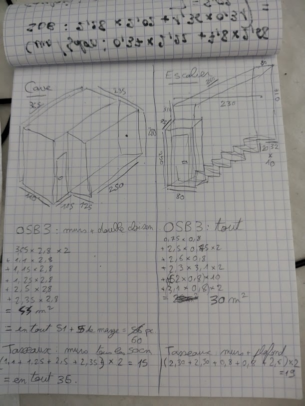 L'OSB3 et les tasseaux c'est pour recouvrir les murs de la future cave et du cellier (anciennement l'escalier qui monte au 1er étage). J'ai fait des calculs compliqués pour déterminer combien il m'en fallait.