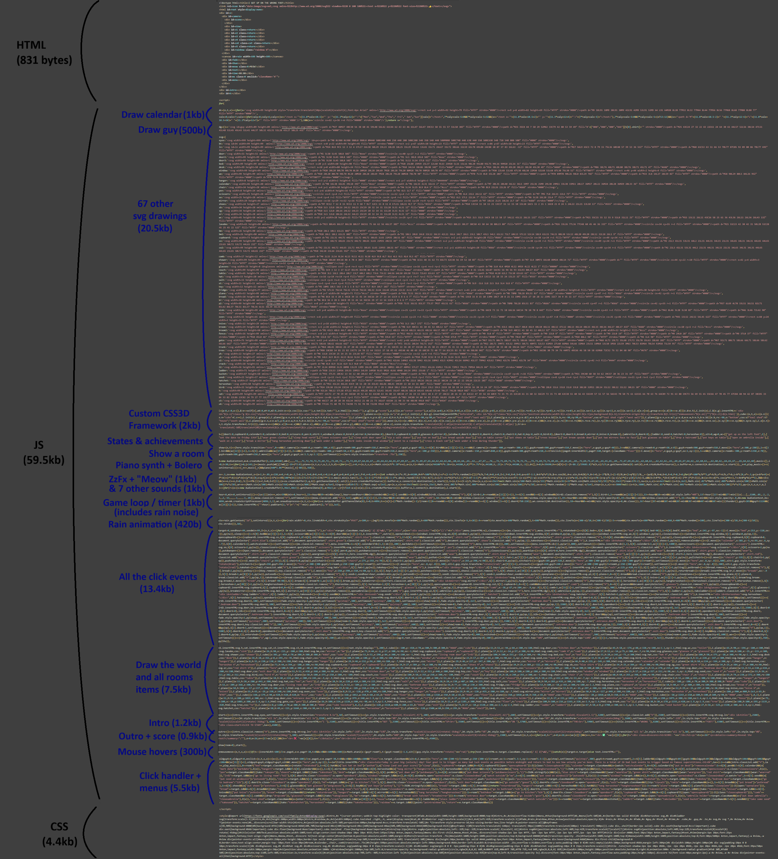 Without any interactivity, this early version of the game's world weighs 4.7kb zipped. It's a chance that SVG graphics compress very well, because I want to include as many as possible! (probably around 60). Here's a glimpse of the code I wrote to draw the kitchen with my CSS3DFramework (full file HERE)